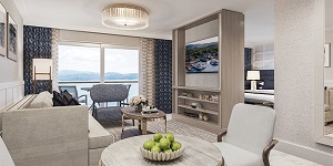 The luxurious Grand Suites are among the finest accommodations afloat with an unprecedented 620-square-feet of personal space. Each suite has a living room, bedroom, interior and exterior dining areas, and a spacious master bathroom. Floor-to-ceiling sliding glass panels in both the bedroom and living room are a feature of the room and lead to a 25-foot-long private balcony with a table, chairs, and chaise lounge. The living room has a full-size couch and 60” inch TV, while the dining area has ample counterspace with replenished treats and a stocked refrigerator. The master bedroom has an additional 60” TV and is available in king size or two twin bed configurations. The master bathroom has a double vanity with a large shower. Additional amenities in each Grand Suite include an oversized double wardrobe, underbed suitcase storage, drawer and cabinet space, writing desk, plush robes, safe, and complimentary WiFi.