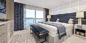 Triple glass panels extending from floor to ceiling have made the Sky Suite one of our most popular room categories. These exceptionally large 470-square-foot rooms include a spacious private balcony with a table and chairs, as well as plenty of interior space to make yourself at home. Each suite has a seating area facing a 54” inch led TV, counterspace with replenished treats, and a stocked refrigerator. King or two twin bed configurations are available. Additional Sky Suite amenities include a wardrobe, large bathroom with double vanity, underbed suitcase storage, drawer and cabinet space, writing desk, plush robes, safe, and complimentary WiFi.