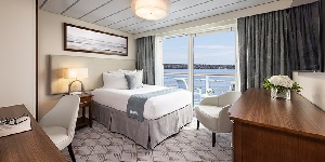 These dedicated single staterooms are 280-square-foot enclaves for the solo traveler. Each room has all the same amenities as the double occupancy staterooms, including a floor-to-ceiling glass door leading to a full-size private balcony with a table and chairs. Single staterooms have a queen size bed and large bathroom. Each room also includes a small wardrobe, drawer storage, under bed suitcase storage, 54” inch led TV, writing desk, safe, and complimentary WiFi.